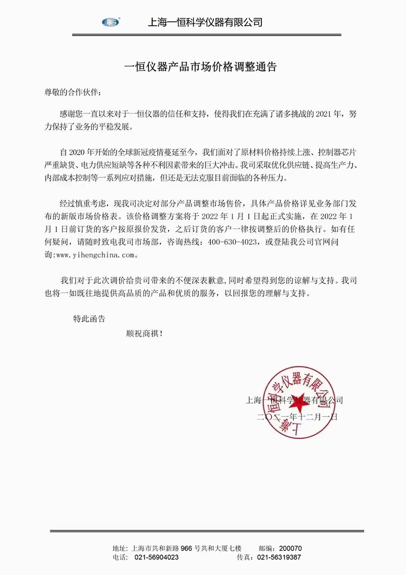 上海一恒調(diào)價通知將于2022年1月1日正式實施